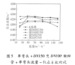 圖5為單彎頭+DN150變DN100漸縮管+單彎頭流量-儀表系數曲線。